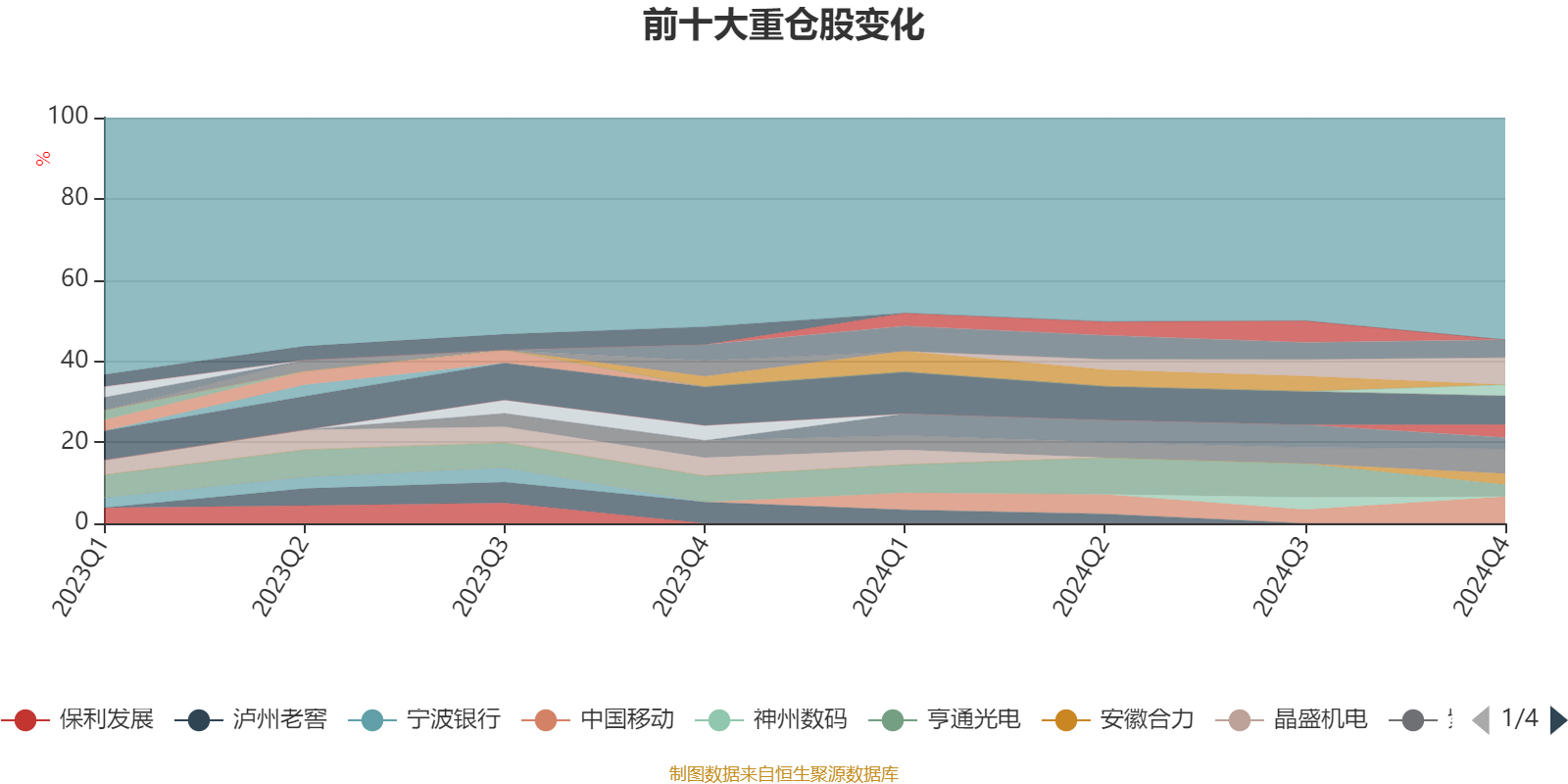 截至2024年四季度末,基金十大重仓股分别是中天科技、波司登、中国移动、紫金矿业、江苏银行、新锐股份、亨通光电、蓝天燃气、兖矿能源、安徽合力。