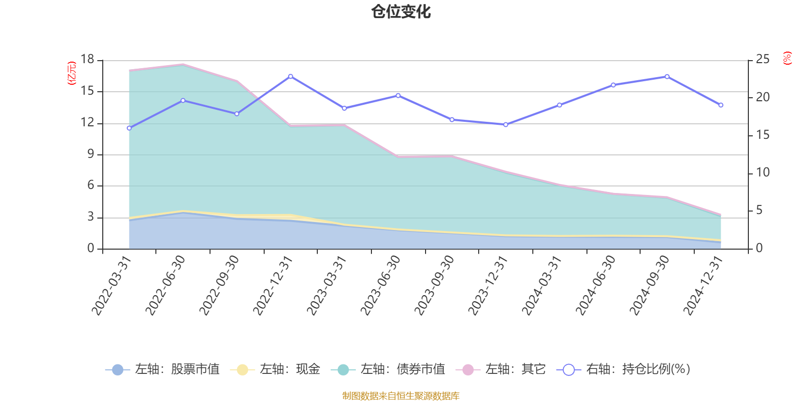据定期报告数据统计,近三年平均股票仓位为19.3%,同类平均为18.69%。2022年末基金达到22.85%的最高仓位,2022年一季度末最低,为16%。
